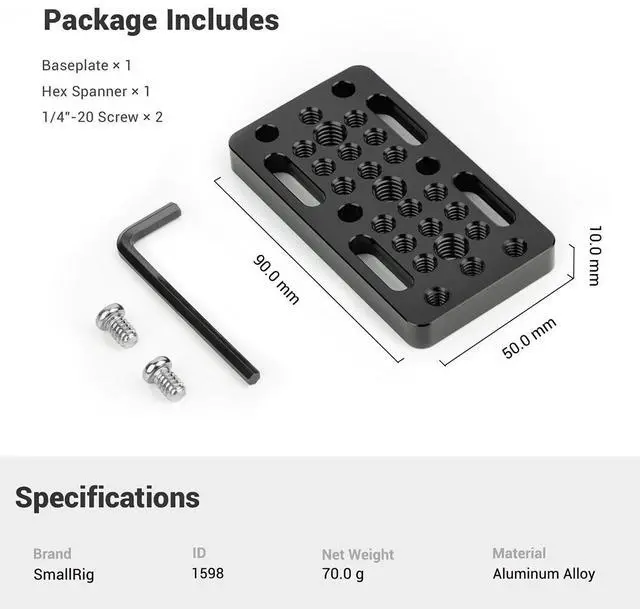 The Mounting Cheese Easy Plate is a versatile and essential tool for your photography and videography needs. Designed with precision, it features both 1/4"-20 and 3/8"-16 threaded holes, set in standard spacing of 9mm from center to center. This strategic design ensures compatibility with a wide range of equipment. Ideal for use with SmallRig railblocks, dovetails, and short rods, this mounting plate provides a secure and stable platform for your equipment. Its robust construction ensures it can handle the weight of your gear, providing a reliable base for your shooting setup.