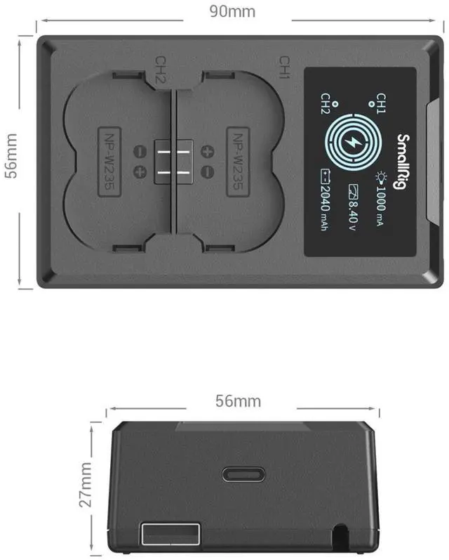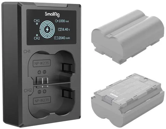 SmallRig NP-W235 Camera Battery Charger 4085 is made of high-quality ABS+PC fireproof material. The surface is frosted, high temperature resistant, tactile and durable. The built-in battery compartment is the same size as the original camera battery closely fits the camera battery compartment, and is installed without jamming. The charger adopts a double-slot design, which can charge two batteries at the same time. The LCD screen displays the charging voltage, charging current, and charging quantity in real-time, allowing users to see the charging voltage, charging current, and quantity more intuitively.