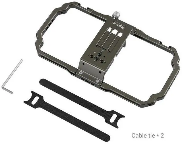 The 1/4 threaded holes in the front can be used to attach the SmallRig Power Bank Holder 2790, which enables to clamp a power bank to the rig when a sustainable charging solution is required. It features two rotatable handgrips, which are great for a handheld shooting. It also supports both horizontal shooting and vertical shooting. Inbuilt rubber pads help absorb shocks and prevent your phone from scratching. Two cable ties are attached, which can be used to sort out the messy data cord and microphone cord during shooting. It's lightweight and easy to hold.