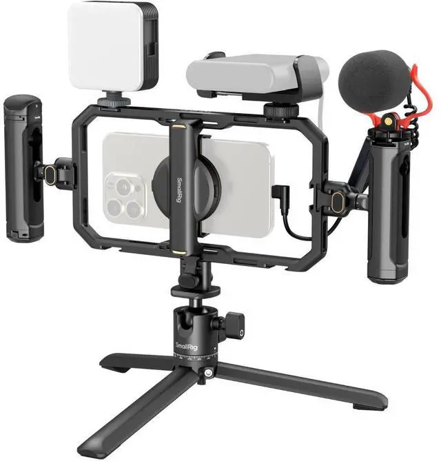 Just imagine elevating your smartphone videography with the SmallRig Quick Pro Edition All-In-One Video Kit for Smartphone Creators, model 4704. This comprehensive kit is designed to meet the needs of professional smartphone video shooting, offering an all-encompassing solution for creators. It includes a universal cage compatible with most smartphones, a rotating quick release handle, a quick release metal tabletop tripod, a high-quality shotgun microphone, a bi-color fill light, a power bank clamp, and a versatile 2-in-1 USB-C PD fast charging and audio adapter, along with other essential accessories.