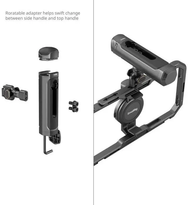The upgraded universal cage is engineered with multiple 1/4"-20 threaded holes and cold shoe mounts, allowing for the seamless integration of additional professional video equipment. It also supports the attachment of 67mm magnetic filters and features a shoulder strap hole and a dock mounting slot for enhanced versatility. The innovative rotating side handle offers infinite rotation, ensuring a comfortable grip from any angle. It can be effortlessly switched between side and top handle modes, thanks to its adaptable mounting methods. The rotating quick release adapter is designed with a damping adjustment range of 9.0 - 11.0 kg ( 19.8 - 24.2 lbs), providing stability, reliability, and flexibility during use.
