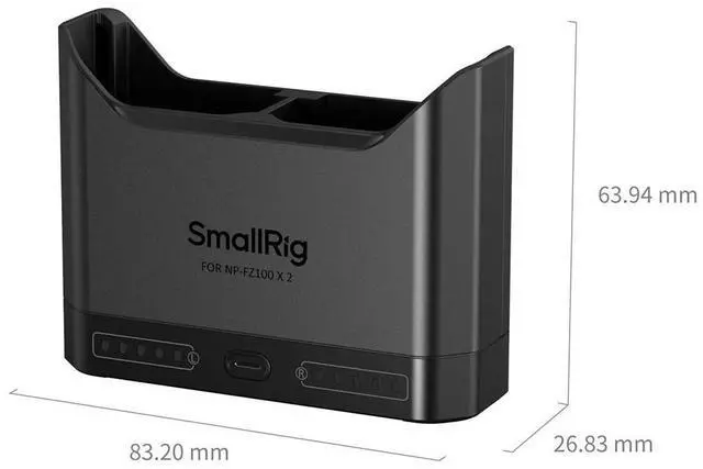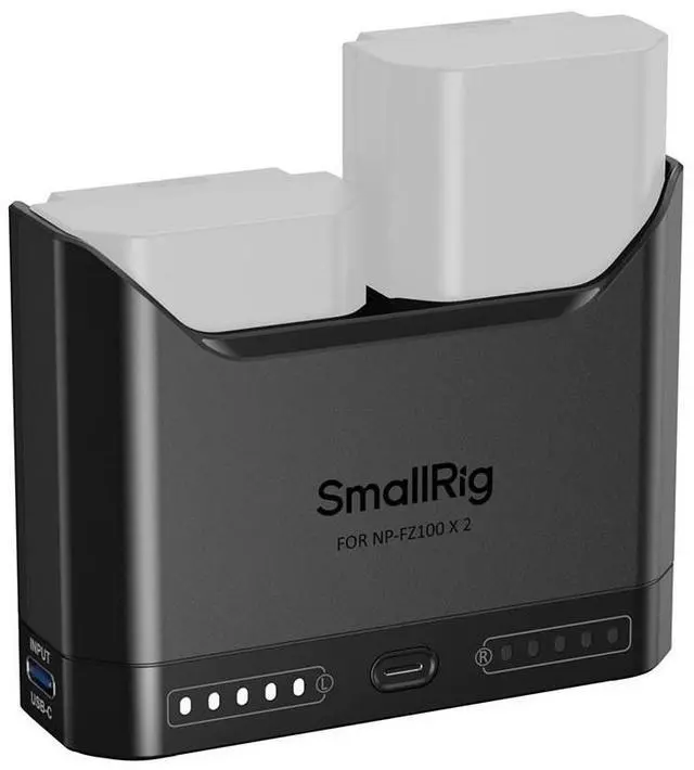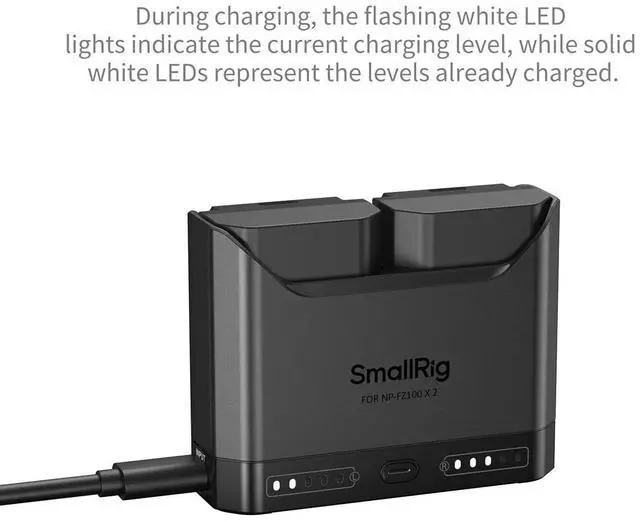 SmallRig Camera Battery Charger for NP-FZ100 5489 guarantees full compatibility with Sony NP-FZ100 batteries and is capable of charging both original and third-party batteries. The charger's dual-slot design allows for simultaneous charging of two batteries or single-battery charging, fully charging two batteries in approximately 2 hours for optimal efficiency. Intelligent circuitry offers multiple safety protections, including over-temperature and over-voltage safeguards. It monitors temperature and voltage, automatically slowing down charging during overheating, cutting off power in case of overvoltage, and employing trickle charging near full capacity to preserve battery health. Each charging channel features five LED indicators that display power levels in 20% increments, even without external power.