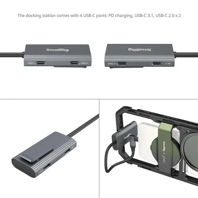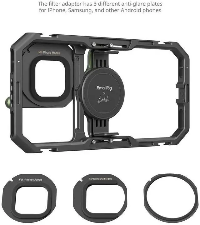 SmallRig x Brandon Li All-in-One Mobile Video Kit Full Quick Release Co-design Edition 4596B is the perfect one-stop solution for professional smartphone video shooting. The kit includes a universal mobile phone cage, a rotatable side handle with M.2 SSD enclosure and wireless remote controller, a 67mm universal filter adapter, a magnetic 67mm VND 2-32 (1-5 Stop), a 4-In-1 USB-C docking station, an Arca-Swiss quick release adapter, a power bank holder, and other accessories. The universal cage supports 67mm magnetic filters, providing anti-glare solutions for most mobile phones and reducing filter light leakage. The rotatable side handle with wireless control integrates multiple functions and features an enclosure for M.2 SSD to support direct external recording.The detachable wireless control enables remote shooting, focusing, and zooming in/out. Stepless rotation of the handle adapter allows instant switching between the side and top handle modes, while the quick release mechanism on both sides enables swift, tool-free assembly and adjustment. Also, the kit comes with an Arca-Swiss quick-release adapter, supporting quick attachment to the cage and professional tripods. The cage kit provides multiple standard 1/4"-20 threaded holes and cold shoe mounts, supporting the free combination of accessories, and providing more possibilities for shooting. The 4-in-1 USB-C docking station offers a high-power PD 100W charging port, a USB-C 3.1 port, and two USB-C 2.0 ports. When used for mobile videography, it enables simultaneous charging, ProRes video storing, and utilization of a USB-C microphone.x Brandon Li Renowned creator Brandon Li and SmallRig collaborated again to redefine the landscape of professional mobile video production. The new All-in-One Mobile Video Kit, crafted under Brandon Li's extensive creative expertise, embodies not only the daring essence of an explorer but also marks a groundbreaking leap in content creationExpanded Options for Broad CompatibilityNote: Due to size constraints, MagSafe attachment and 67mm magnetic filters cannot be used simultaneouslyComprehensive Interface Configuration 16x 1/4"-20 Threaded Hole 5x Cold Shoe Mount 6x QR Mount 2x Strap Slot Optimized Handle Positioning For desktop vertical shooting Innovative Cold Shoe Mount Mounting option for expansion docksSleek Design and Premium MaterialsStreamlined design with exclusive co-branding logoWork With: The cage is compatible with mobile phones ranging from 57mm (2.2in) to 85mm (3.3in) in width, allowing for use with phone cases When magnetically connecting a mobile phone, it is recommended to use it with a mobile phone case featuring MagSafe to enhance the magnetic attraction
