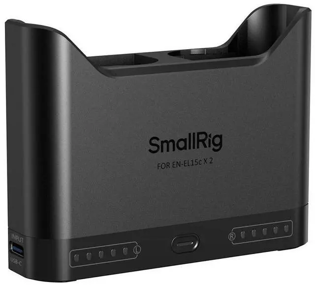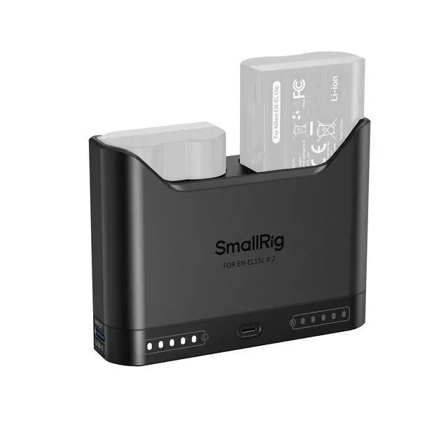 SmallRig Camera Battery Charger for EN-EL15c 5491 guarantees full compatibility with Nikon EN-EL15c batteries and is capable of charging both original and third-party batteries. The charger's dual-slot design allows for simultaneous charging of two batteries or single-battery charging, fully charging two batteries in approximately 2 hours for optimal efficiency. Intelligent circuitry offers multiple safety protections, including over-temperature and over-voltage safeguards. It monitors temperature and voltage, automatically slowing down charging during overheating, cutting off power in case of overvoltage, and employing trickle charging near full capacity to preserve battery health. Each charging channel features five LED indicators that display power levels in 20% increments, even without external power.