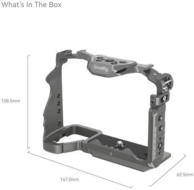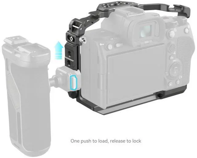 This system ensures a secure fit with no false positioning, enabling quick attachment and release to significantly boost disassembly efficiency. For secure camera attachment, the cage utilizes a bottom locating pin, a 1/4"-20 screw, and an M 2.5 screw on the left side. The side lock adapters are adjustable to accommodate different camera models. Specifically, adapters marked "A7 IV" are intended for the Alpha 7 IV and Alpha 7R V, while those marked "A7S III" suit the Alpha 7S III, Alpha 1, and Alpha 7R IV. The cage is designed with built-in protective spacers to prevent scratches, ensuring your camera remains pristine.
