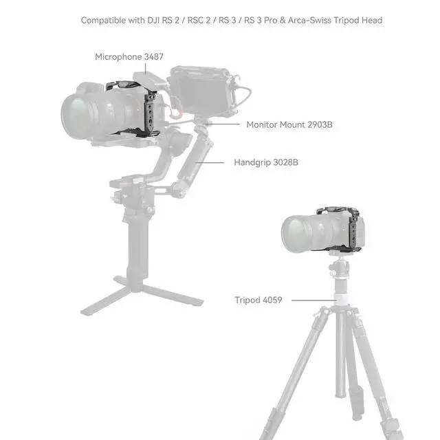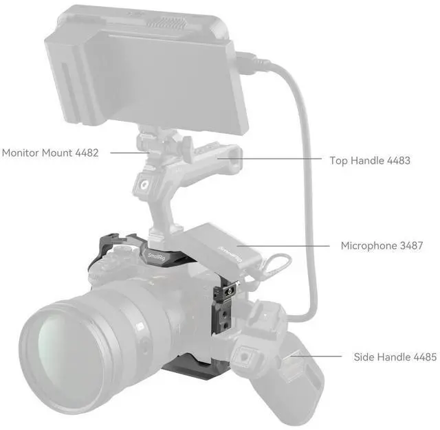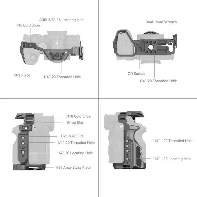 It provides unobstructed access to essential camera interfaces, dials, buttons, and battery doors. A spindle spanner located in the battery compartment is ergonomically designed to fit the camera's curve, offering a comfortable grip with room for your little finger. The SmallRig cage is equipped with multiple mounting options, including 1/4"-20 threaded holes, ARRI 3/8"-16 locating holes, and HawkLock cold shoe mounts. These support a wide range of accessories such as the top handle 2165C, side handle 2093, monitor mount 2903, microphones, LED lights, and monitors.