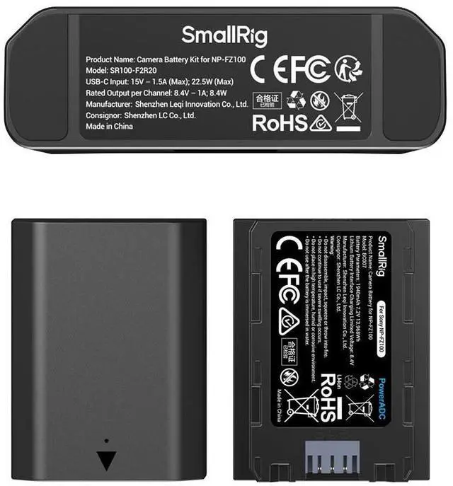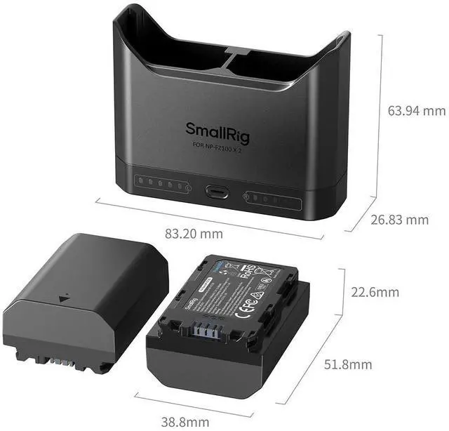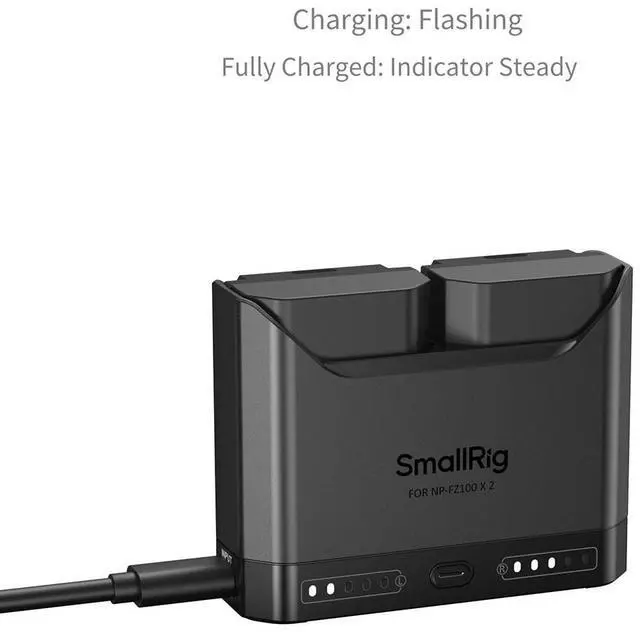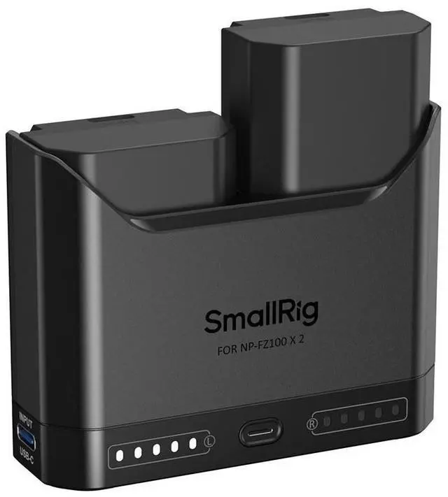 SmallRig Turbo Charging Kit for NP-FZ100 Camera Batteries 5483 includes two high-performance batteries and a dual-channel fast charger. Featuring a full decoding chip, this kit ensures full compatibility with Sony NP-FZ100 batteries, eliminating pop-up warnings while supporting in-camera power display and original charger use. Each battery delivers a true-rated output of 1940mAh, providing extended shooting time for demanding workflows. The charger's dual-slot design allows for simultaneous charging of two batteries or single-battery charging, fully charging two batteries in approximately 2 hours for optimal efficiency. Intelligent circuitry offers multiple safety protections, including over-temperature and over-voltage safeguards.