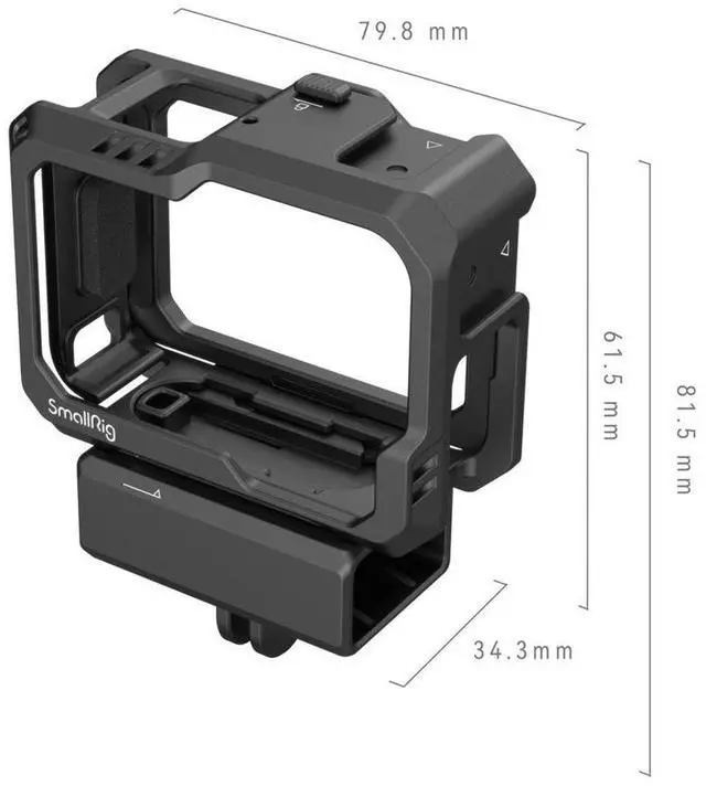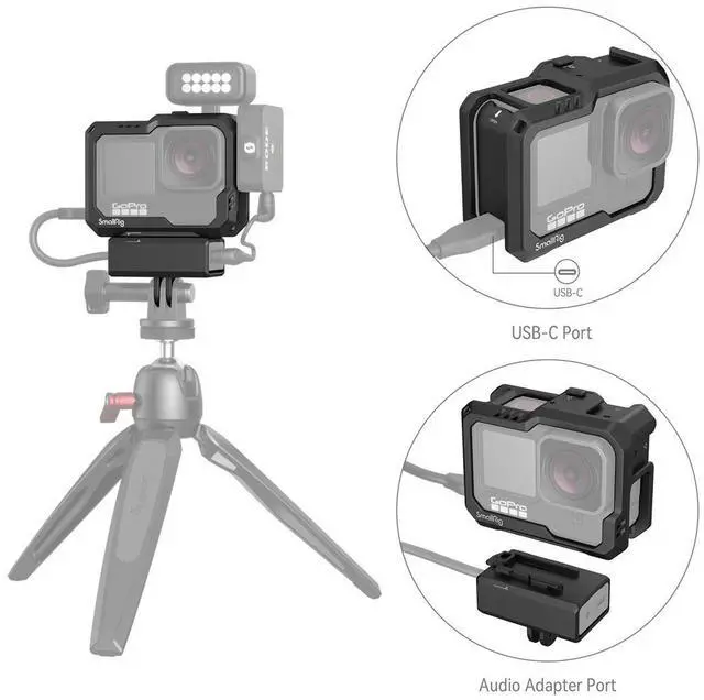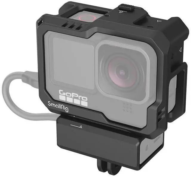 The SmallRig Cage Kit's bottom mount is designed to support the original GoPro 7/8 microphone adapter. Its innovative side plate can be interchanged with the original one, enabling audio recording while charging, a feature that sets it apart from other camera cages. Designed with precision, the cage ensures unobstructed access to the screen, buttons, and USB-C port of your GoPro camera. The quick-lock mechanism allows for easy installation and removal of the camera, requiring only a simple press of the cover and push of the button. The cage kit's bottom also boasts a dedicated foldable GoPro mount, designed to accommodate the original GoPro baseplate or other accessories.