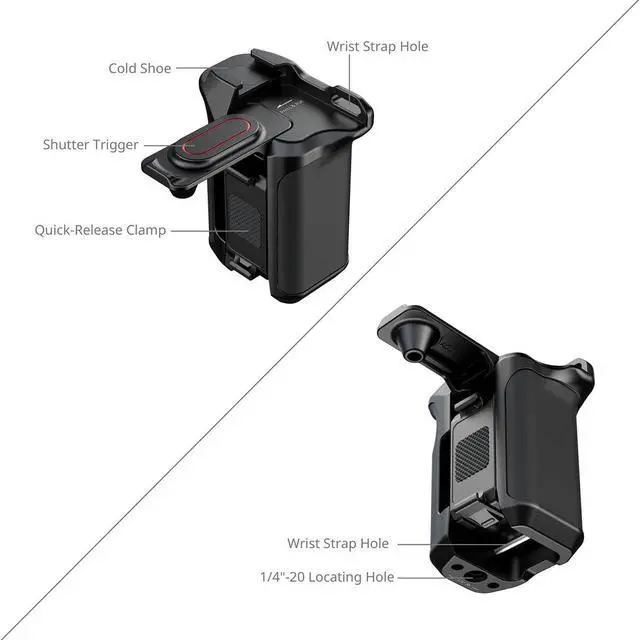 SmallRig Cage Kit for DJI Osmo Action 5 Pro / 4 / 3 5602 is specifically designed for street photography with DJI Osmo Action 5 Pro / 4 / 3 cameras. The complete kit includes a cage, a handle, and a wrist strap. Featuring magnetic quick release mounts, the cage and handle can be directly assembled without tools, boosting shooting efficiency. The wrist strap provides added safety during street photography, preventing accidental drops. The integrated foldable shutter button seamlessly tucks into the handle when not in use, maintaining a compact profile while effectively preventing accidental activation during storage in bags or pockets.