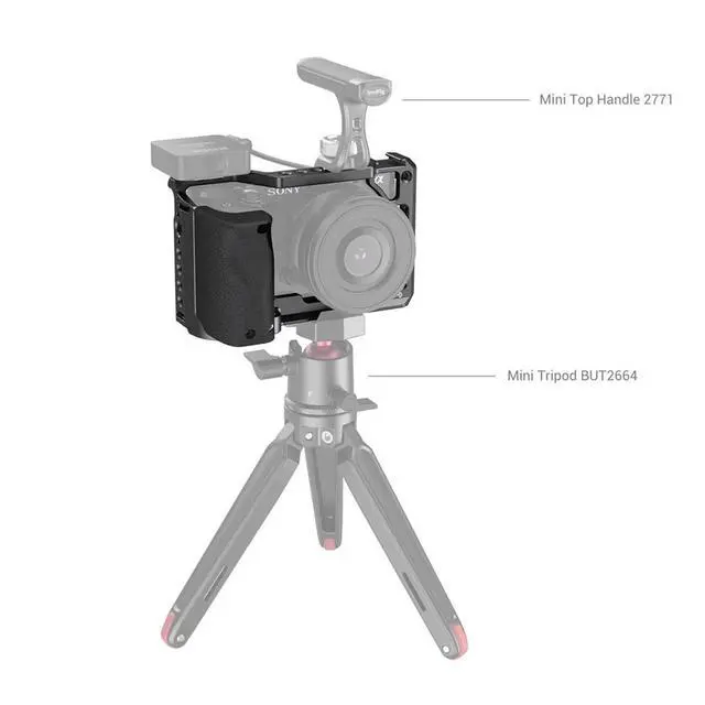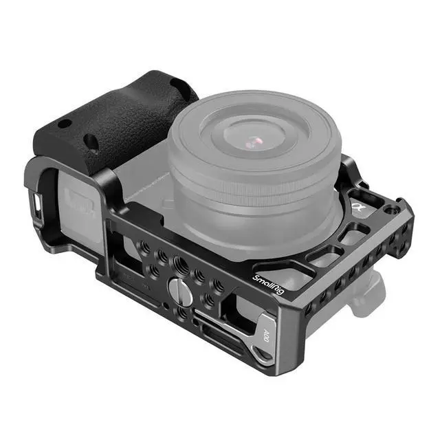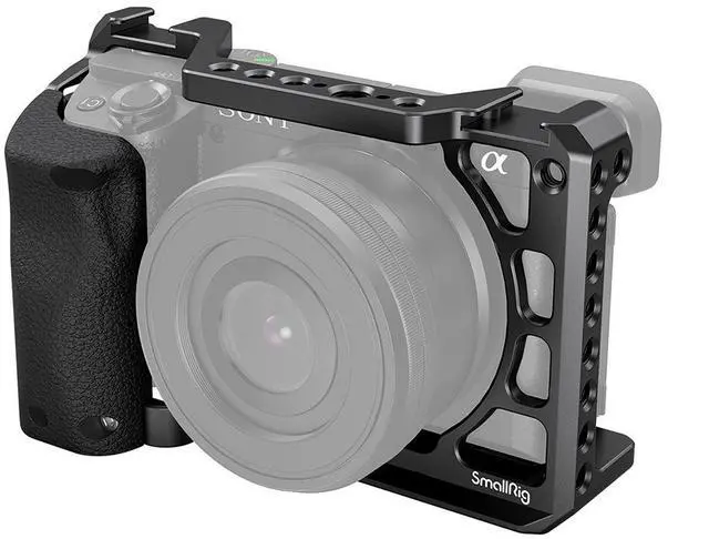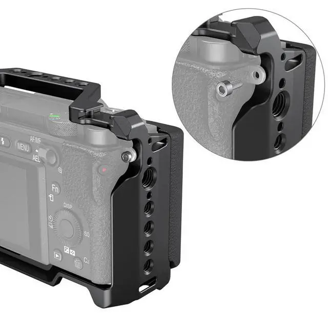 SmallRig Cage with Silicone Handle for Sony A6100 / A6300 / A6400 3164B is designed to protect the camera and provide multiple expansion interfaces. It securely locks the camera with one 1/4"-20 screw at the bottom and one M2 screw on the left side, ensuring stability without deviation. The cage features an ergonomic silicone handle for improved grip. The cage features multiple 1/4"-20 holes, 3/8"-16 ARRI locating holes for attaching accessories like the top handle (ID 3765), and side handle (ID 4016) for handheld shooting, assisting with focusing, enhancing shooting stability, and allowing for monitor expansion using the top ARRI locating hole for attaching the monitor mount (ID 2903B).