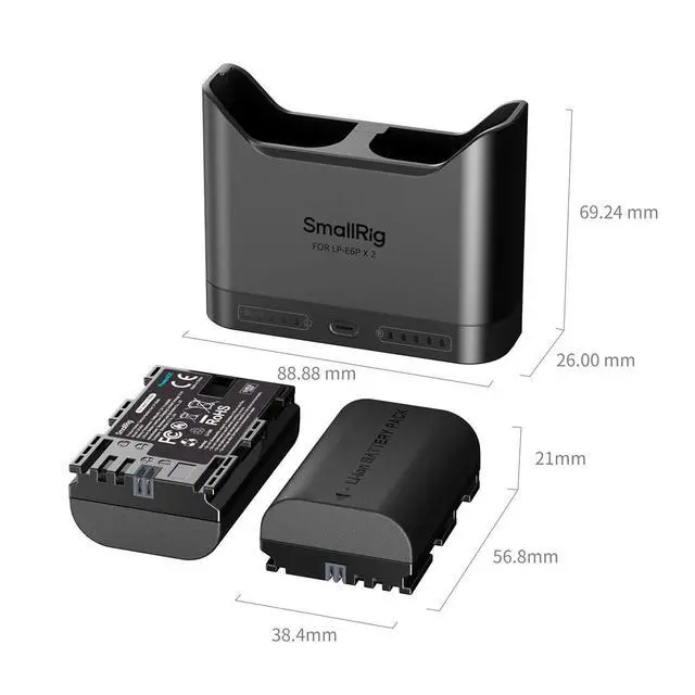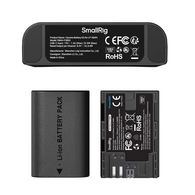 SmallRig Turbo Charging Kit for LP-E6NH Camera Batteries 5484 includes two high-performance batteries and a dual-channel fast charger. Featuring a full decoding chip, this kit ensures full compatibility with Canon LP-E6NH batteries, eliminating pop-up warnings while supporting in-camera power display and original charger use. Each battery delivers a true-rated output of 1940mAh, providing extended shooting time for demanding workflows. The charger's dual-slot design allows for simultaneous charging of two batteries or single-battery charging, fully charging two batteries in approximately 2 hours for optimal efficiency. Intelligent circuitry offers multiple safety protections, including over-temperature and over-voltage safeguards.