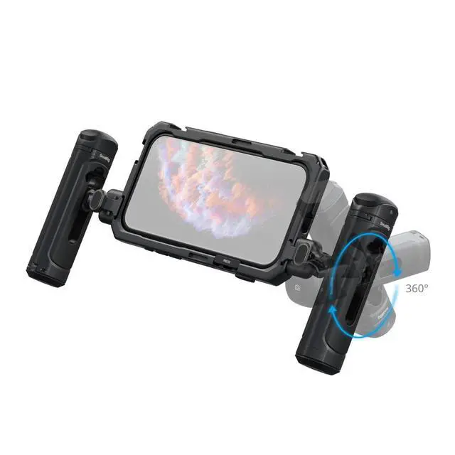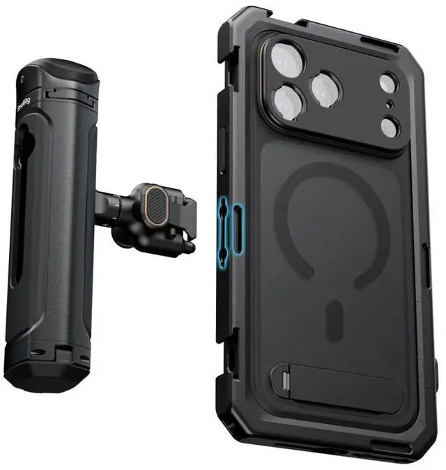 SmallRig Mobile Dual Handheld Kit for iPhone 17 Pro 5540 is a professional dual handheld shooting solution designed specifically for iPhone 17 Pro, facilitating professional-level video recording, live streaming, and short film production. This comprehensive kit includes a phone case, video cage, rotatable wireless control side handle, rotatable side handle, and TPU soft bumper. In addition to providing daily protection for the phone, the case comes standard with a T-mount backplate and a 17mm threaded lens backplate for external lens mounting. The T-mount backplate can be replaced with a 67mm magnetic filter adapter (sold separately) for enhanced optical output.