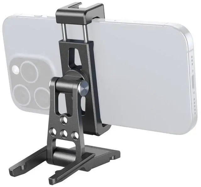 With the ability to switch swiftly between landscape and portrait orientations, this holder offers flexibility for various shooting styles. It accommodates a wide range of phone sizes, from 57mm to 90mm ( 2.2 to 3.5 inches), including the iPhone 15 Pro Max with a case, ensuring compatibility with most modern smartphones. Enhancing its functionality, the holder features a 1/4"-20 threaded hole at the bottom, perfect for tripod mounting, and a cold shoe mount at the top, allowing you to attach essential accessories like a microphone or LED video light.