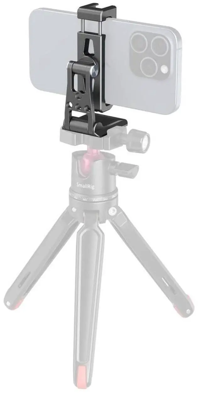 Explore the versatility and precision of the SmallRig Metal Phone Holder with Arca-Swiss Support 4611, expertly crafted for seamless content creation using your mobile phone. This innovative phone holder is specifically designed to integrate effortlessly with Arca-type tripods, allowing for quick transitions between different mobile content setups. Whether you're using an Arca-Swiss baseplate-equipped tripod or the DJI RS 3 mini stabilizer, this holder ensures stability and ease of use. The SmallRig 4611 is not just limited to tripod mounting; its extendable bottom support allows it to be placed securely on flat surfaces, making it ideal for tabletop shooting.