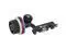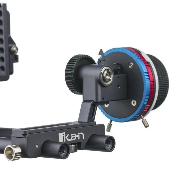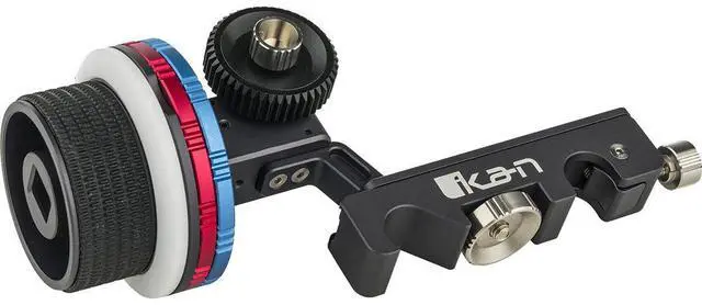 The STR-FF is a follow focus from Ikan's STRATUS line with built-in hard stops and horizontal placement. The hard stops are set with screws in red and blue aluminum rings. To set a stop, simply tighten the screw on the desired band, and then do the same with the other band to set a hard focus range. Stops can be completely removed by removing the screws or, to keep from losing pieces, the user can simply disengage the stop itself and flip it off of the hand wheel. The STR-FF comes with a.