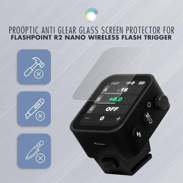 Bring an added layer of protection to your Flashpoint R2 Nano Wireless Flash Trigger with the Pro Optic Anti Glare Glass Screen Protector. Expertly crafted to safeguard your flash trigger screen from dust, scratches, smudges, and unexpected impacts, this screen protector is a must-have for any photography enthusiast. Designed to perfectly fit the screen dimensions of your Flashpoint R2 Nano Wireless Flash Trigger, this protector is made from ultra-thin, shatterproof optical glass. Once applied, it seamlessly integrates with your device, providing a virtually invisible shield. Unlike flexible material screen protectors, this glass protector won't trap air bubbles against the screen, ensuring a smooth, flawless application.