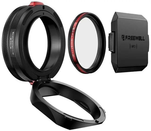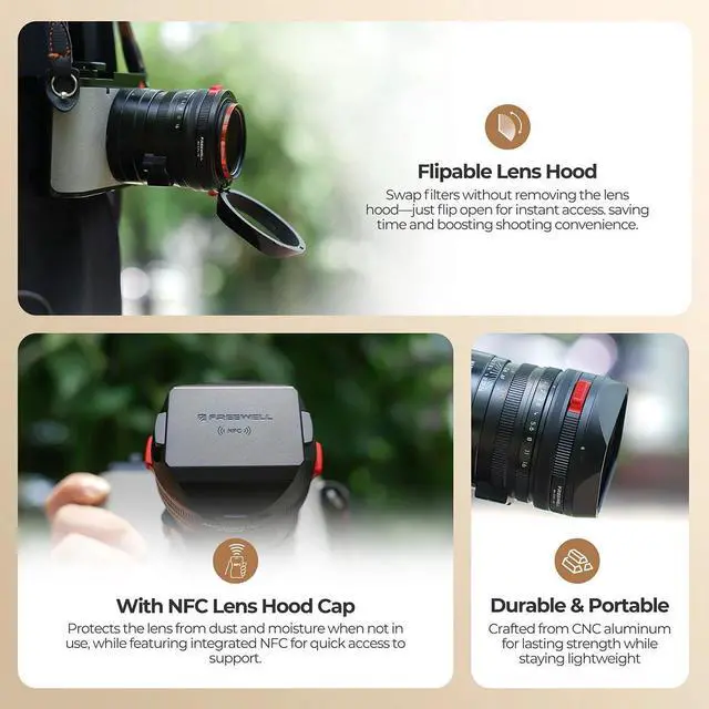 Enhance your Leica Q3 43 with Freewell's lens hood featuring CPL & Black Mist filters, touchless operation, Flippable design, and NFC cap.