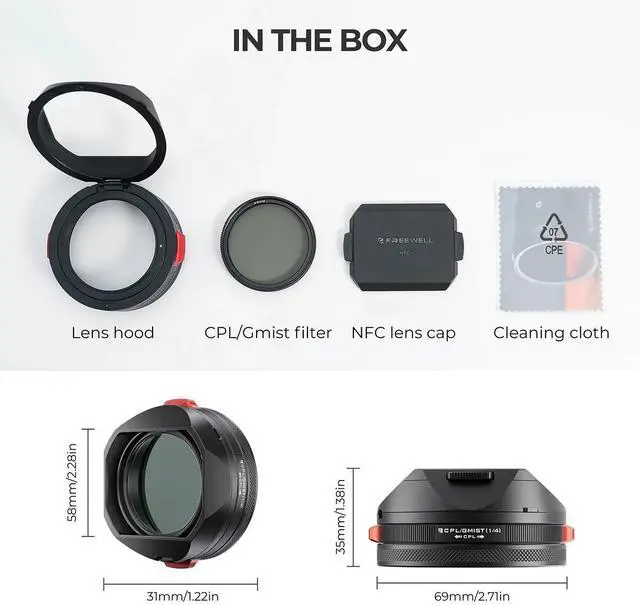Rotate your filters effortlessly without touching them by using the specially designed tabs. This feature allows for smooth adjustments and faster shooting, perfect for on-the-go photographers. Simplify your filter adjustments by rotating the red tabs with ease. Enhance efficiency without physically interacting with the filter itself.Flippable Lens HoodChange your filters without completely removing the lens hood. Simply flip it to access the filter, saving you valuable time and enhancing convenience during shoots.CPL and Black Mist FiltersThe lens hood comes with a hybrid 49mm CPL (Circular Polarizer) / Black Mist filter with a 1/4 strength. These filters enhance contrast and reduce glare while adding a soft, cinematic look to your shots.CNC Aluminum ConstructionMade from premium CNC aluminum, this lens hood is designed for long-lasting strength and portability while maintaining a lightweight profile.NFC Lens Hood CapWith integrated NFC technology, the included lens hood cap provides easy access to essential support documents directly through your smartphone or device.Lens Hood for Leica Q3 43Invest in the Real Lens Hood for Leica Q3 43, meticulously constructed from high-grade metal for unmatched performance and style.Flip to Swap the filter