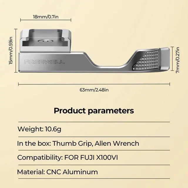Enhance your Fuji X100VI with the Freewell thumb grip featuring a cold shoe mount, ergonomic design, and precision CNC aluminum construction for better comfort and control. Cold Shoe Mount Easily attach accessories like microphones or external lights to your grip, maximizing your setup without compromising space or convenience. Optimize your Fujifilm X100VI for peak performance! Enhanced Comfort & ControlThe ergonomic design improves your handheld shooting experience, making it more stable and comfortable for longer shooting sessions. Precision CNC Aluminum ConstructionEngineered for durability and style, this grip is both lightweight and robust, perfectly complementing your Fuji X100VI camera.