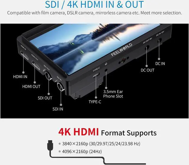 The monitor equipped with SDI and 4K HDMI input and output, compatible with film camera, DSLR camera, mirrorless camera, realize simultaneous monitoring by directors, photographers and 1st AC, support up to 4K@30Hz, the screen is smooth and clear. And provides 3.5mm headphone jack to monitor audio.