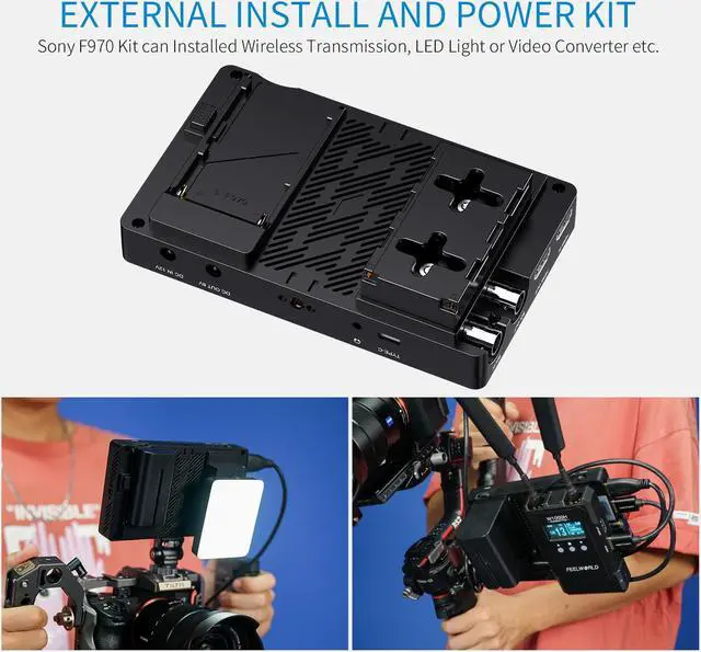 A Sony F970 external install and power kit design is added to the back of the monitor. The external kit can be used to install and install the external equipment, like wireless transmission, LED light, video converter and others that can be powered by a Sony F970 battery. Greatly saving the space occupied by the equipment and reducing the weight of photography equipment. The kit has two cross slots, you can adjust the position of the external device by loosening the screws. When you don't need the kit, you can directly loosen the screws to remove the kit.