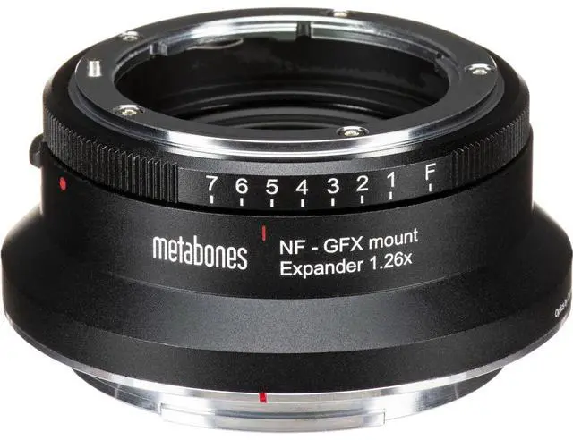 The NF - GFX Expander 1.26x allows Nikon F mount lenses to be mounted on Fujifilm GFX camera bodies without getting dark and / or soft corners. The magnification factor of 1.26x perfectly matches the image circle of the full-frame Nikon lenses to the medium-format sensor of the GFX series cameras, and therefore the diagonal FOV remains exactly the same.