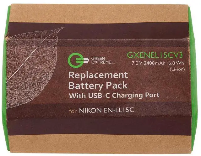 It is designed to meet or exceed the original manufacturers' specifications for compatibility and performance, utilizing renewable energy cells to maximize efficiency. Even the packaging reflects this dedication, being crafted from recycled materials to support environmental responsibility. Choose the EN-EL15c 16.8W h 7.0V 2400mAh Lithium-Ion Battery Pack with USB-C Charging Port for a dependable, high-capacity power solution that ensures your Nikon camera remains operational for longer periods, allowing you to focus on capturing life's precious moments.