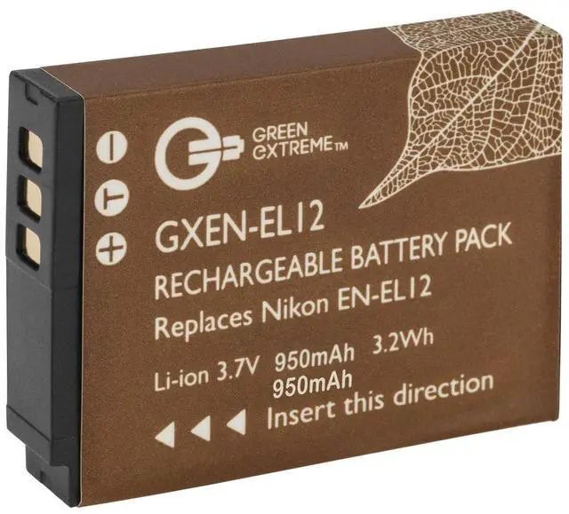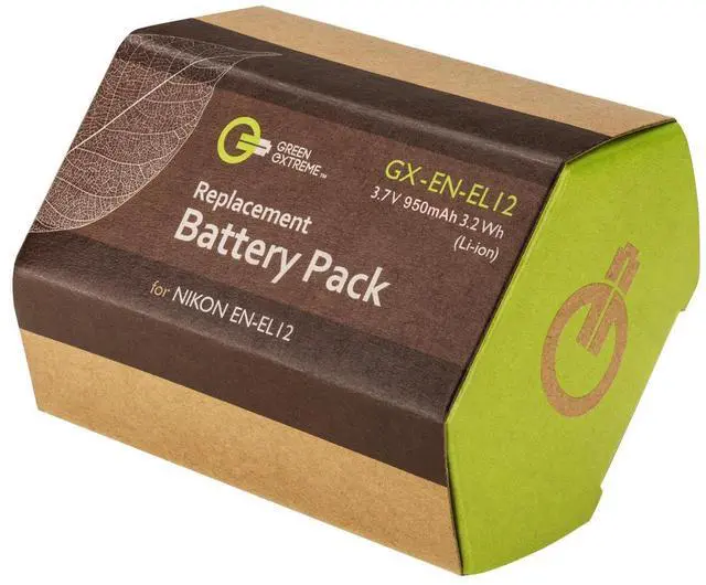 This durable and high-quality battery is compatible with a wide range of Nikon CoolPix models including S610, S610c, S70, S1000pj, and AW100. Whether you're looking for a replacement battery or a spare one, the Green Extreme EN-EL12 is an affordable choice that delivers the power you need, when you need it. Even our packaging reflects our commitment to the environment, made from recycled materials. Power up your energy-demanding cameras and devices with the Green Extreme EN-EL12 Lithium-Ion Battery Pack, the perfect recharge and go power source for your Nikon cameras.