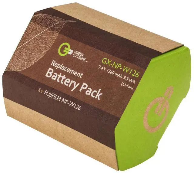 The Green Extreme NP-W126 Lithium-Ion Battery Pack is designed to meet or exceed original manufacturers' specifications, ensuring optimal performance and compatibility with your Fujifilm camera. This battery pack is not just a power source, but a commitment to energy responsibility. It encourages conservation through the use of renewable energy cells, maximizing their use and contributing in a modest way to energy sustainability. Even the packaging of the Green Extreme NP-W126 Lithium-Ion Battery Pack is made from recycled material, reflecting our commitment to environmental responsibility. Power up your energy-demanding cameras and devices with this high-capacity, reliable, and eco-friendly battery pack.