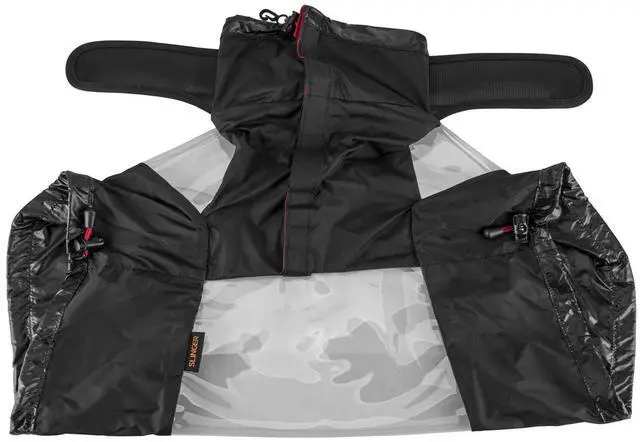 Photographers can bravely face the rigors of whatever the weather throws their way with theSlinger Lightweight Heavy-duty Rain Cover for DSLR's with lenses up to 70-200mm.Optics as long as 18 inches and a full-size speedlight, mounted on the hotshoe, are safe and sound within. The shelter is large enough for even a hefty zoom with a lens hood. And even more, the shield acts as a safety zone for your delicate and expensive gear while you enjoy all of the visibility and function you are accustomed to experience. Crystal clear heavy thermoplastic polyurethane (TPU) panes provide unobstructed vision clarity of camera controls. Double zippered, elastic arm apertures, Velcro closures provide no-excuse camera operation. Unimpeded access to lens and battery changing, it's as though the unfavorable conditions were all dissolved, and it's all frogs and snails and puppy dog tails. You are ready for anything the Good L-rd throws at you.The motto goes: "Neither snow nor rain nor heat..." - for