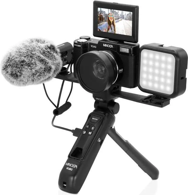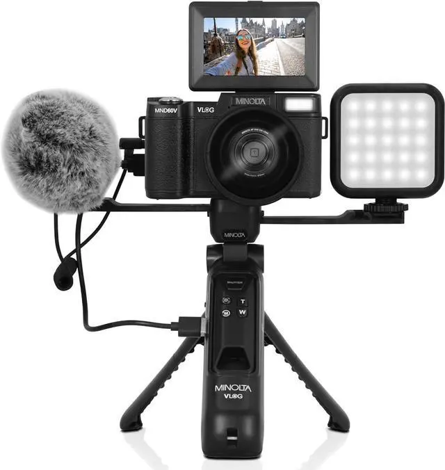 Capture life's moments in stunning detail with the Minolta MND60V 64 MP Autofocus / 4K60FPS Ultra HD VLOG Camera Kit. Featuring a remarkable 64MP photo resolution and 4K Ultra HD video capability, it ensures every image and video is rich in clarity and vividness. With a 16x digital zoom lens, you can explore new perspectives and capture distant subjects with precision. Perfect for vloggers, it comes equipped with essential accessories like an external microphone, wide angle lens, and a tripod with a built-in 2, 500 mAh backup battery for uninterrupted recording.