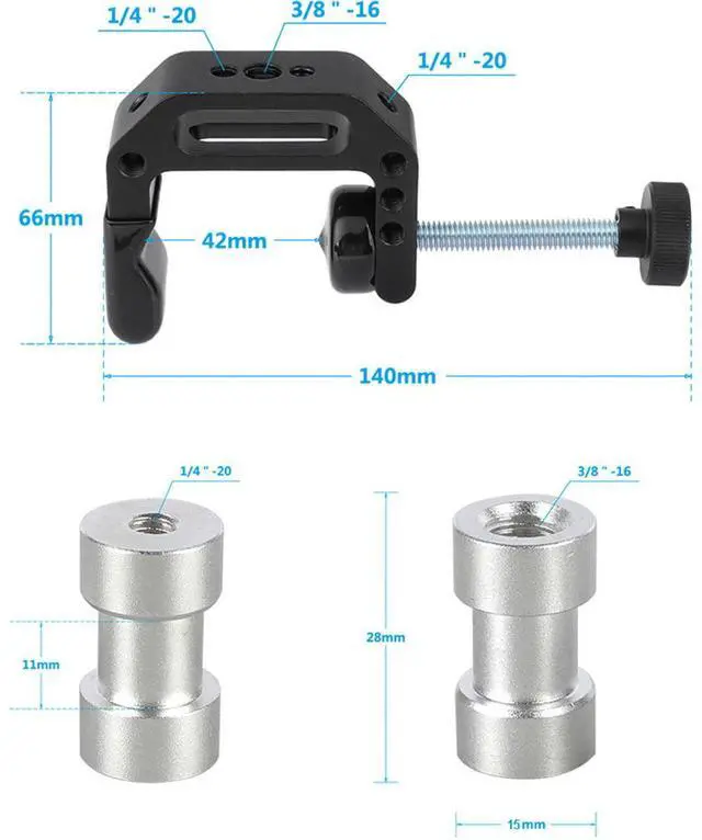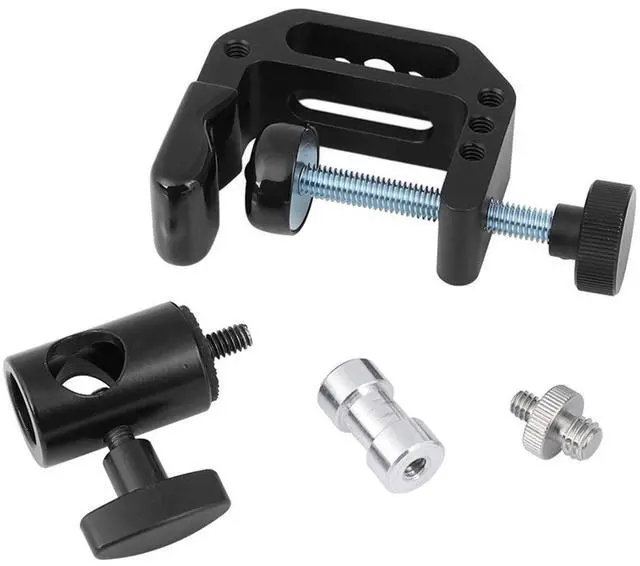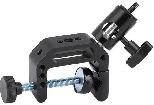 With the integrated 1/4"-20 and 3/8"-16 male and female threaded screw mounting points, this CAMVATE Combination could conveniently hold up your accessory to shelves, plate glass, cross bars, steel, desktop and more for the opening of the jaw ranging from 3mm to 42mm. You can mount accessory via the 1/4"-20 thread screw on the light stand head, the lighting stand head adapter also can be directly inserted into the top of a light stand (with column tube diameter no more than 16mm) and fastened by knob.