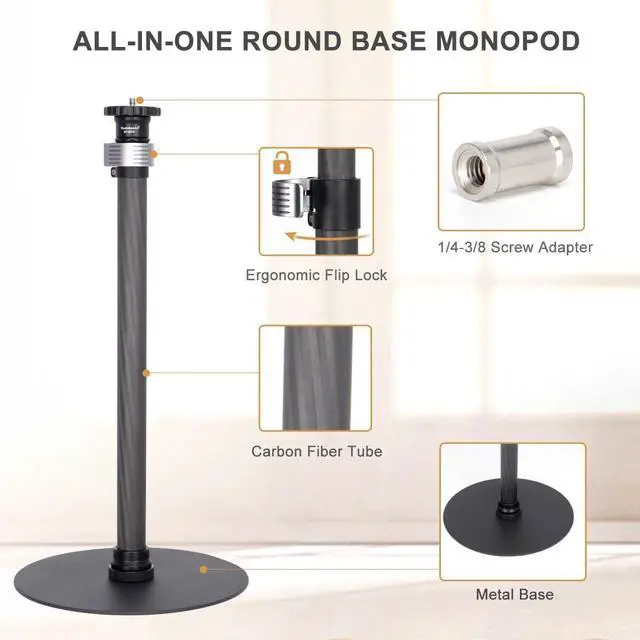 Sturdy & Stable Construction: The Monopod Leg tubes are made of 10X high-density Carbon Fiber.Better heat resistance and corrosion resistance. 25mm thick Carbon Fiber tubes and 20cm diameter heavy-duty round base provides stable support. Load up to 33 lbs