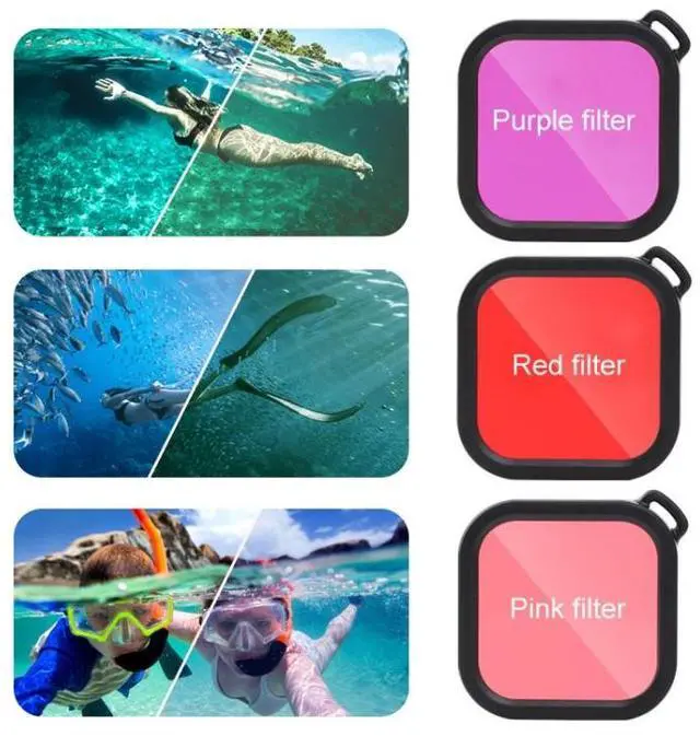 7. With 3 color filters: Purple filter helps color correction in freshwater lakes and reservoirs that appears green. Red filter for professional color correction under blue and tropical water, absorbed red color at depth of 5-25m, prevent taking pictures too blue or too green. Pink is designed to correct light blue or shallow water.