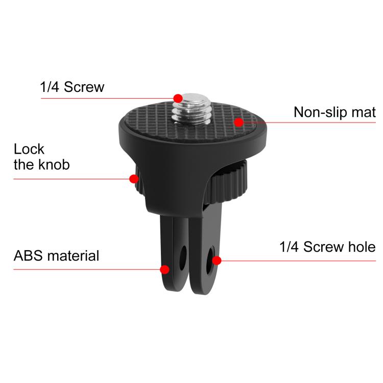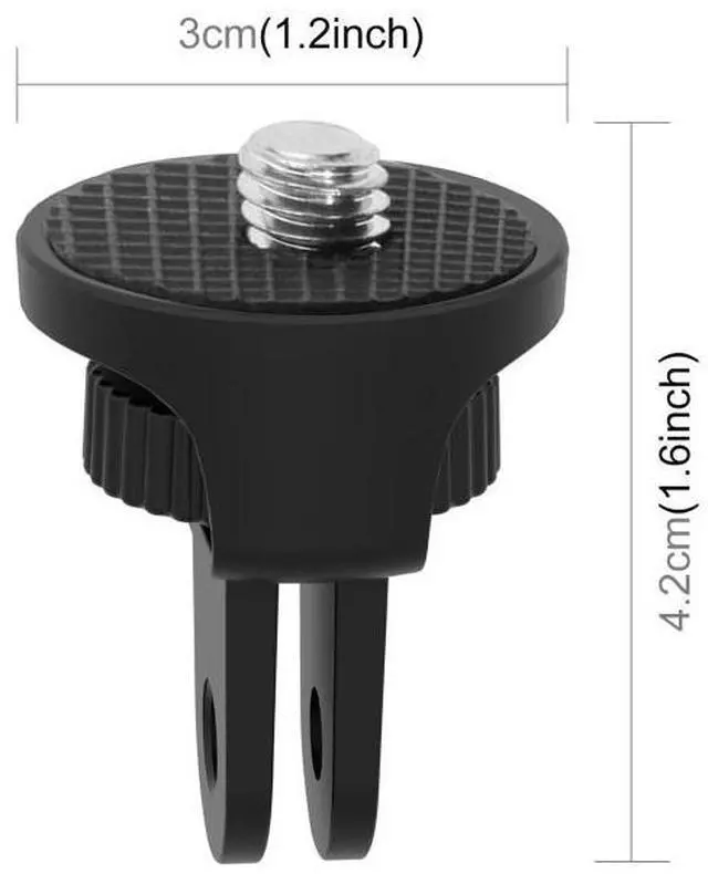1. This portable tripod adapter support standard 1/4 inch threads. 2. Made from premium quality ABS for extended durability. 3. With this 1/4 inch screw you can easily attach your camera to many camera accessories on the market, like bicycle handle bar mount (directly), head strap(directly), chest strap (buckle and J-hook mount needed), some wrist or hand mount straps (directly or buckle needed), car suction cups (directly or buckle needed). 4. Light weight and small size, it is convenient to carry and use. 5. Compatible with all mounting accessories with the lateral screw. Just plug in, screw in place, then attach sport cameras.