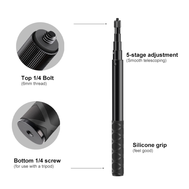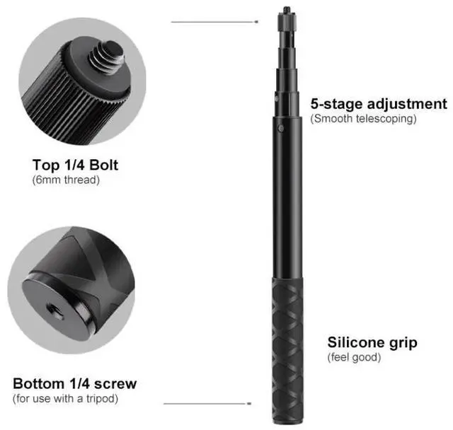 4. The base has a 1/4 screw hole, which can be connected to a triangular clip or an extension rod, and the top is a 1/4 screw, which can be connected to a camera, mobile phone clip or adapter, etc.;