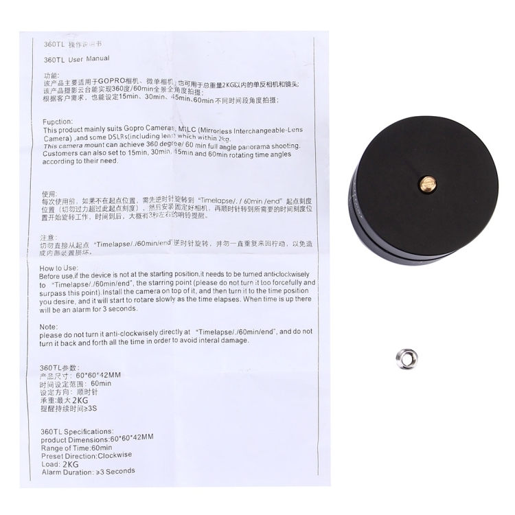 1. This product mainly suits for GoPro & micro single & DSLR camera within 2kg. 2. This camera mount can achieve 360 degrees / 60minfull angle panorama shooting. 3. You can set it to 15min, 30min, 45min or 60min rotating time angles according to your needs. 4. Please do not turn it anticlockwisely directly at "time lapse 60min end", and do not turn it back and forth allthe time to avoid internal damage.