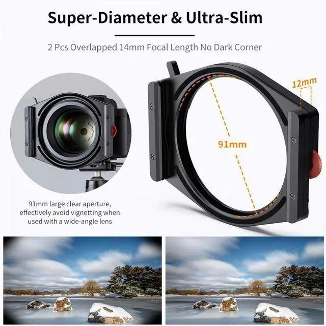 It also features a large 91mm clear aperture, effectively minimizing vignetting even when used with wide-angle lenses. This ensures that your images remain clear and distortion-free, regardless of the lens you're using. Included in this system are 100x100mm Square ND8, ND64, and ND1000 filters. These filters have undergone a meticulous double-sided polishing process, ensuring high-definition picture quality that will impress even the most discerning photographers. Each filter is also treated with a 28-layer nano coating, offering superior protection against dust, water, and fouling. This anti-scratch coating safeguards your lens and filters, ensuring they remain in pristine condition for longer.
