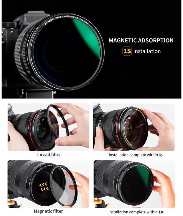 After the glass is optically polished, it is coated with a high-tech film that provides multiple protective qualities. This filter boasts "Moldproof, " "Waterproof, " "Anti-scratch, " and "Anti-greasy" properties, ensuring that it remains durable and easy to clean. Whether faced with water droplets or oily fingerprints, the filter's surface can be wiped clean without affecting image quality. The filter is complemented by an aviation-grade aluminum alloy material magnetic lens cover, which is both magnetic and threaded. This dual functionality allows for seamless integration with your lens, providing a two-in-one solution that enhances the versatility of your photography equipment.