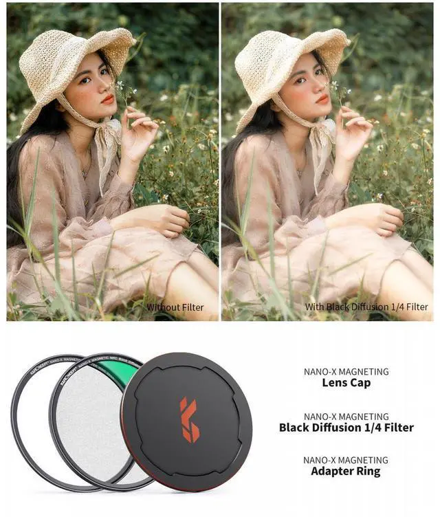 Quick installation and removal, magnetic filter can be installed in one second. 1/4 of the black soft filter can soften the wrinkles, spots, pores, etc. of the human skin, and the more delicate, plump, beautiful and hazy movie effects can be better realized. Able to achieve high definition within 550mm focal length. The top optical glass, the front and back of the lens adopts double-sided multilayer antireflection coating, which can effectively reduce the reflection of the filter surface and avoid problems such as ghosting. The standard transmittance rate of 1/4 black soft is 87%.