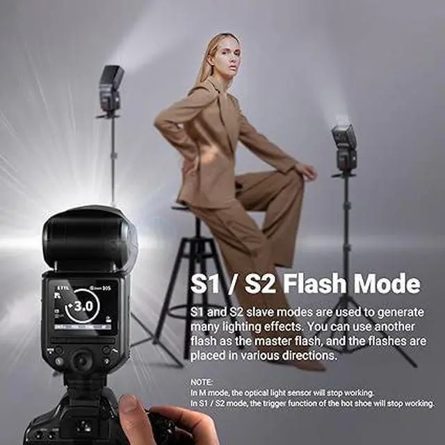 Optical Slave & Off Camera Triggering Supports S1/S2 optical modes for off camera use as a secondary flash to create various lighting effects. S1 works with the main flash in manual mode, while S2 works with the main flash in TTL mode. Equipped with a PC sync port for triggering the flash and camera via a sync cable
