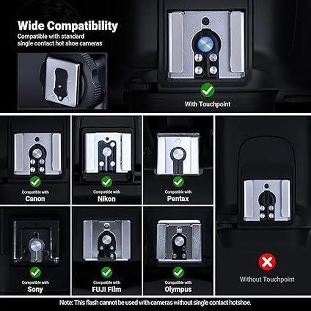 Wide Compatibility NEEWER TT560 flash attachment for photography accessories is compatible with Canon Nikon Panasonic Olympus Pentax Fujifilm standard hot shoe cameras and Sony MI hot shoe models including A9 A7III A7IV A7RIV A6400 ZV-1 A6000 A6300 A6500. Not compatible with Canon SL3 250D T7 1500D 2000D T100 3000D 4000D R6 200DII R50 Sony A9III A99 A77 A350 ZV-1F ZV1 Mark 2 Fujifilm X-A3X 100F X100T