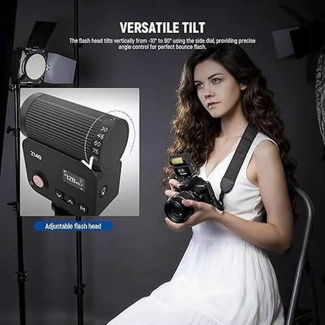 Versatile Tilt & Creative Lighting The flash head tilts vertically from -10° to 90° using the side dial, providing precise angle control for perfect bounce flash. Includes a diffuser and 8 color filters to soften light and create a variety of creative effects