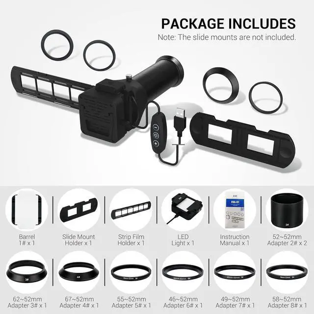 What You Get: 1x Barrel, 2 x 52-52mm Adapter (2#), 1 x 62-52mm Adapter (3#), 1 x 67mm-52mm Adapter (4#), 1 x 55mm-52mm Adapter (5#), 1 x 46-52mm Adapter (6#), 1 x 49-52mm Adapter (7#), 1 x 58-52mm Adapter (8#), 1 x Slide Mount Holder, 1 x Strip Film Holder.