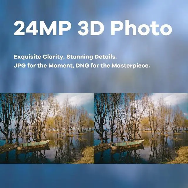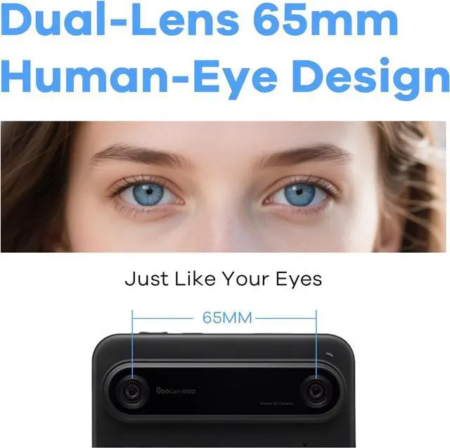 [True-to-Life Experience] - With a 65mm distance between the two lenses, QooCam EGO captures the world just as you see it. 60 frames-per-second capture with an impressive 3840x1080 resolution (video resolution reaches up to 3840x1080 @ 60FPS, and the photo resolution is 8000x3000) creates immersive content with excellent sharpness and brightness, and ensures a clear and smooth experience on large screens and VR headsets.