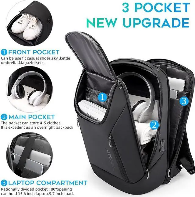 The front pocket can be use fit casual shoes,sky ,kettle,umbrella,Magazine and Other goods,the backpack have 5 pocket,the main pocket can contain 4-5 chothes,the laptop pocket can 180°opening can hold 15.6 inch laptop and the pocket division reasonable can meet your daily needs,Two front pocket can meet your daily needs,You can place anything you have to have any items, such as wallet, pen, convenient sign, etc