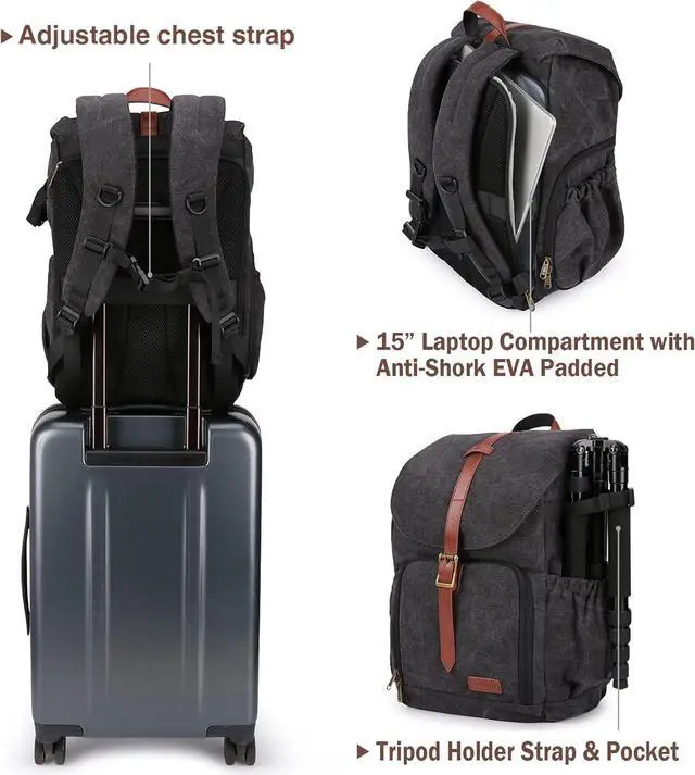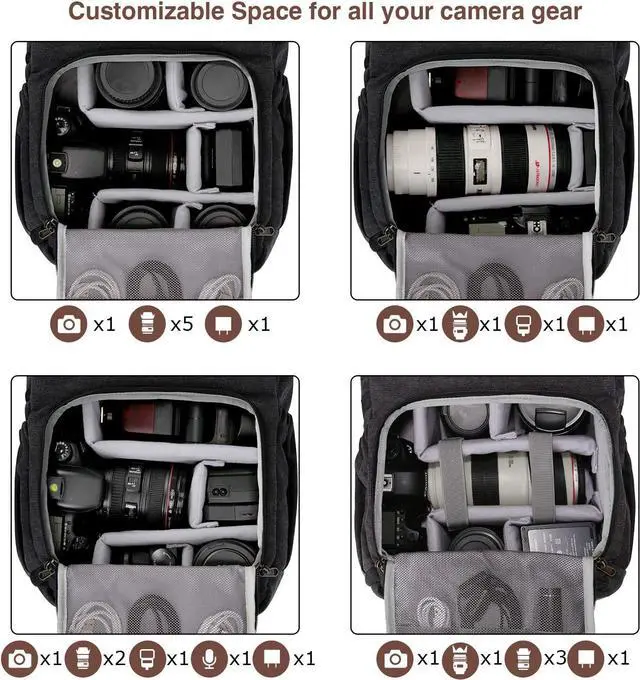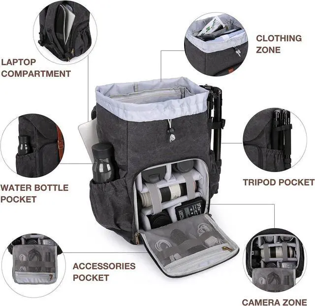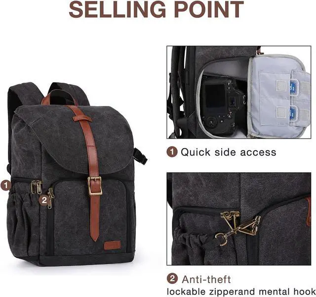 The photography backpack is made of durable and waterproof canvas and comes with a rain cover for weather condition. Lockable zippers and a high-quality metal hook can achieve the purpose of anti-theft