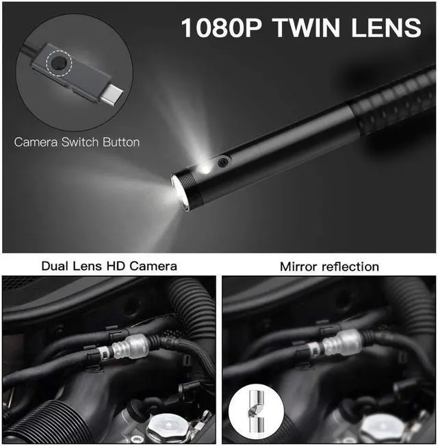 8 mm Endoscope for Vehicle Features: Lens Industrial Endoscope Camera : This lens industrial endoscope features both 1080P front camera as well as a side view camera, together on a single camera probe. so you do not need any additional attachments to view side of the pipe or wall. just press the button on the cable, this borescope inspection camera will show side view. making the inspection easier.