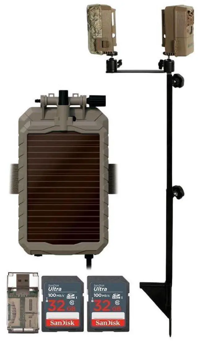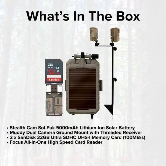 The Muddy Dual Camera Ground Mount in Black features a durable steel construction. It secures up to two trail cams with a standard 1/4-inch-20 threaded receiver by staking firmly into the ground. It is also fully adjustable in height from 19 to 41 inches - direction and angle. The mount has a capacity to hold up to 25 lbs.