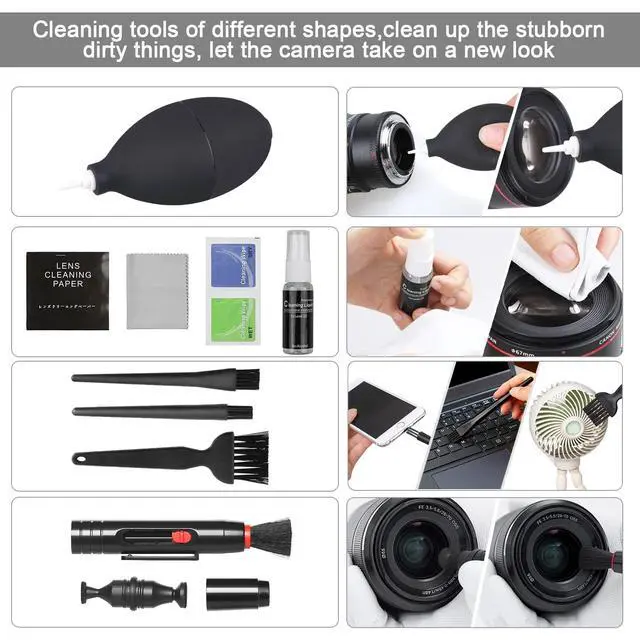 ![]() 17-in-1 Camera Cleaning Kit for DSLR Cameras (Canon, Nikon,Sony) | ![]() 14-in-1 Proonal Camera Cleaning Kit | ![]() 18-in-1 Professional Camera Cleaning Kit for Most DSLR Cameras | |